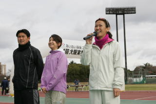 「大会自体が明るくて、ランナーにもがんばろうという気持ちがあるので、がんばろうという気持ちになる」とは2年ぶり3度目の出場となった有森。沿道からは「まだ(陸上)やってんのか?」という声援も多かったというが、久しぶりにナニワの駅伝祭≠楽しんだ様子。「来年もこなきゃね」と早くも来年度大会に照準ピタリだ。