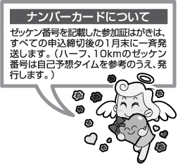 肖像権他 | ●本大会で撮影した写真などを、主催以下関係各団体がそれぞれ発行する新聞、広報誌の記事や広告、ホームページ、または放送に使用する場合がございますので、あらかじめご了承下さい。 ●上位入賞者のお名前等を新聞紙面等に掲載します。 ●記入いただいた個人情報に関しては、弊社主催後援マラソン大会の案内等を送付する場合があります。 |