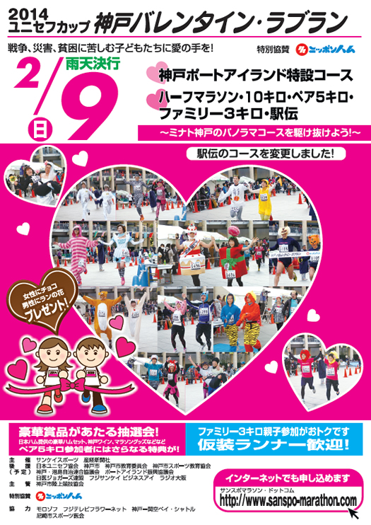 日本で唯一のバレンタインデーにちなんだランニング大会「2014ユニセフカップ神戸バレンタイン・ラブラン」を2月9 日(日)にミナト神戸のポートアイランドで開催いたします。