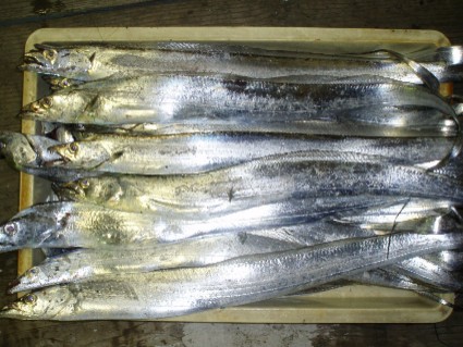 | --風の状況は? 「昼間に沖の南西から風が吹き、これに乗ってタチウオのエサとなる小魚が沖から波止ぎわに寄ってきて、タチウオも接近。夕方から北風にかわると釣り人にとってフォローの風となり、引き釣りでも、ウキ釣りでも仕掛けを飛ばしやすくなります」 --どの釣り方が有利でしょうか? 「明るいうちによく釣れる日はルアー釣りがいいようです。逆に時合が遅い日は、ドジョウをエサにした引き釣りとウキ釣りがよく釣れています。また、天気のよい日はルアーのワームに反応しやすいようです」 |